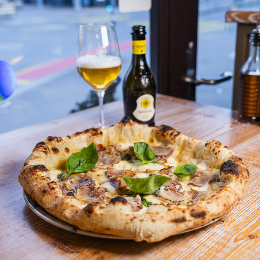 PIZZA MIT PROVOLA-KÄSE, KARTOFFELCREME UND PORCHETTA