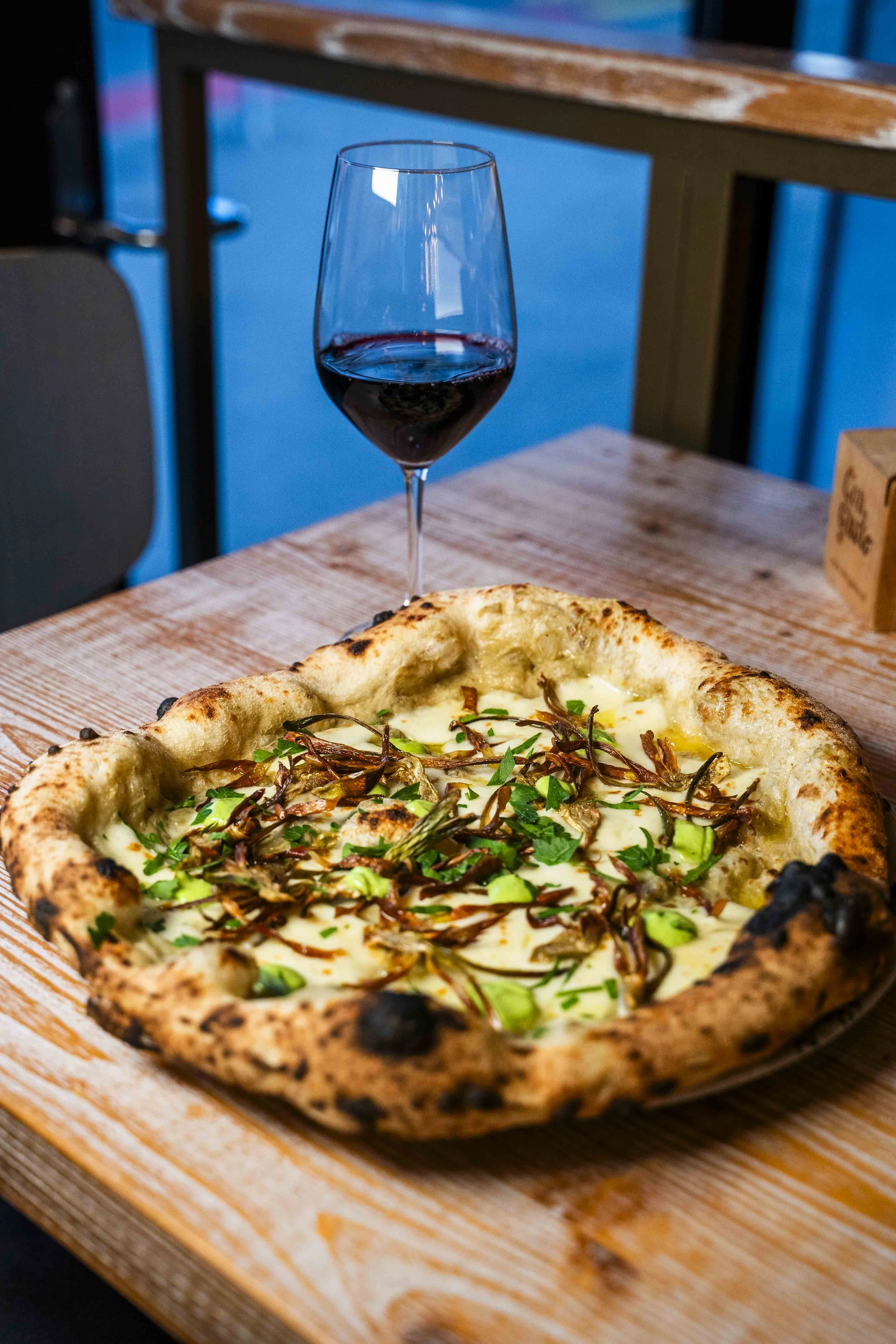 Pizza mit hausgemachter Artischockencreme, Mozzarella, Artischocken-Chips und Petersilien Mayonnaise